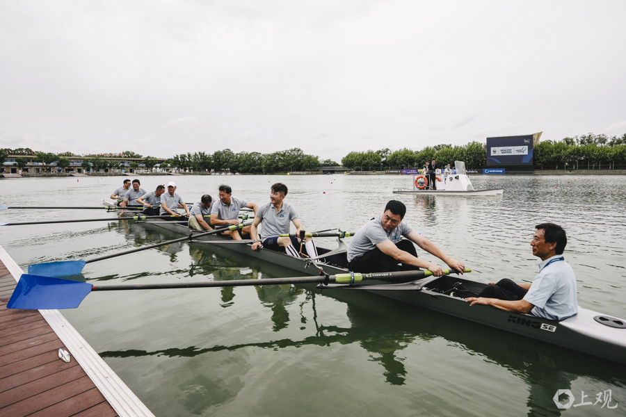 胡兵以前的主项是双人单桨无舵手,八单只划过一次,可他对这个项目怀有情结:“小时候我看到电视里播英国牛津、剑桥大学的赛艇比赛,便由此深深迷上赛艇,他们的项目就是八单。现在,在国内最好的赛艇赛道上,他毫不犹豫地坐上7号位,和当年一样的位置。桨叶同时切入水中,起初几桨还有些生涩,划到500米折返时,不用喊号子,8人的节奏已经完全同步了,像被时光拉回了当年的水面。